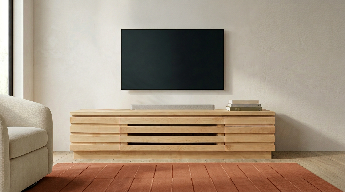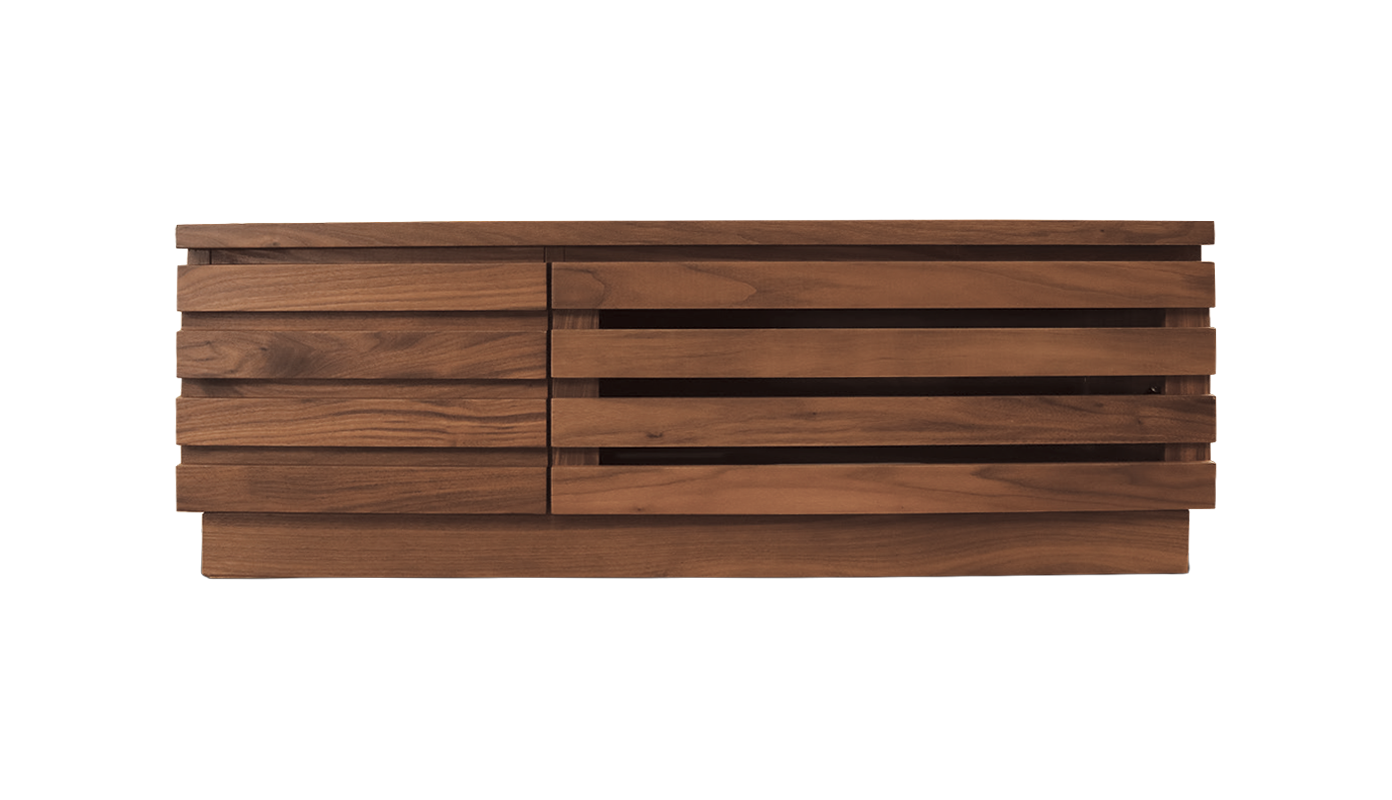 横方向に揃えた前板のデザインが、空間に広がりと落ち着きをもたらします。中央部はスリット仕様となっており、閉じたままでも機器操作がしやすい設計。収納力にも優れ、リビングまわりをすっきりと整えます。