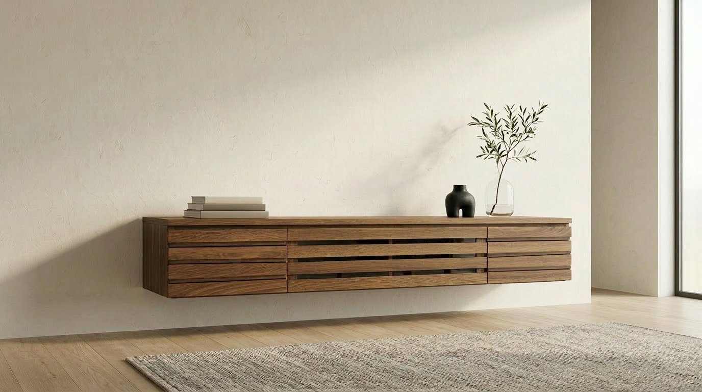 無垢材の素材感を活かした、重厚感のあるローボード。