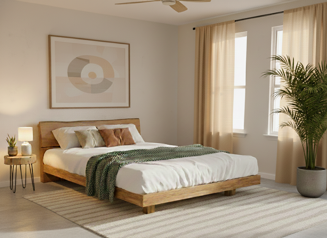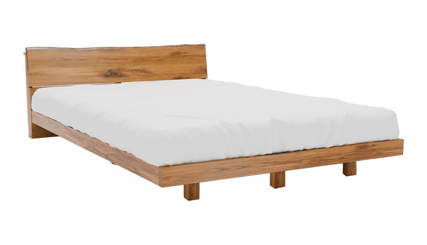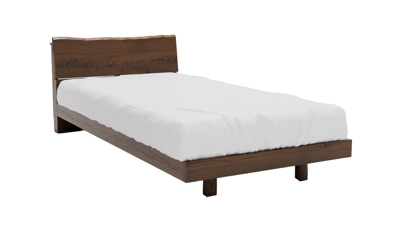 ヘッドボードには無垢材を使用し、木そのものの風合いや力強い木目を活かした仕上がり。樹種によって印象が変わるため、空間や好みに合わせてお選びいただけます。ヘッドボード上部に施された波打ち加工が、人工的になりすぎない天然木らしい表情を生み出し、空間にやさしく自然な印象を与えます。