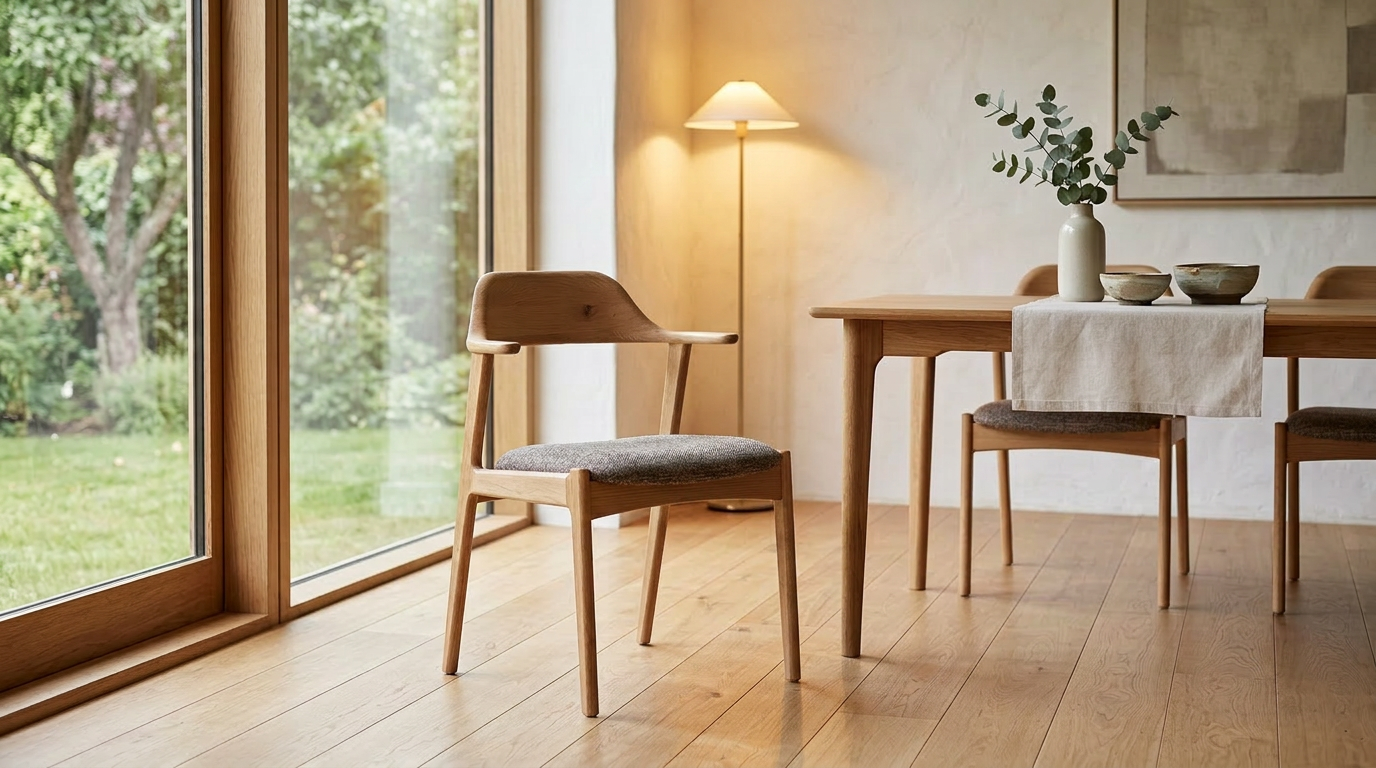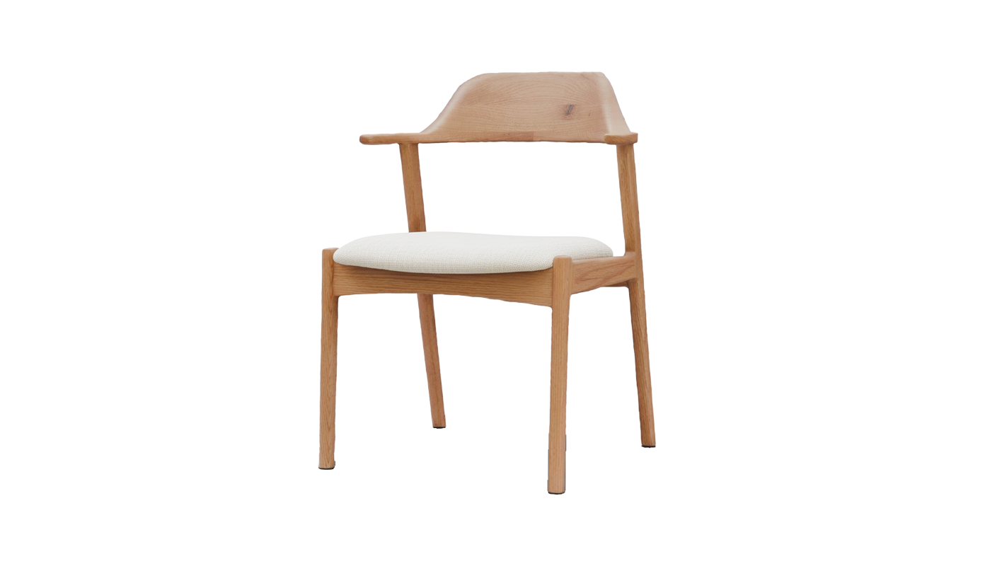 木の温もりをダイレクトに感じられるオーク無垢材のフレームと、広めの座面が特徴的な、デザイン性と機能性を兼ね備えたチェア。肘掛けが短めに設計されているハーフアームタイプなので、椅子を後ろに大きく引かなくても横からサッと立ち座りができます。