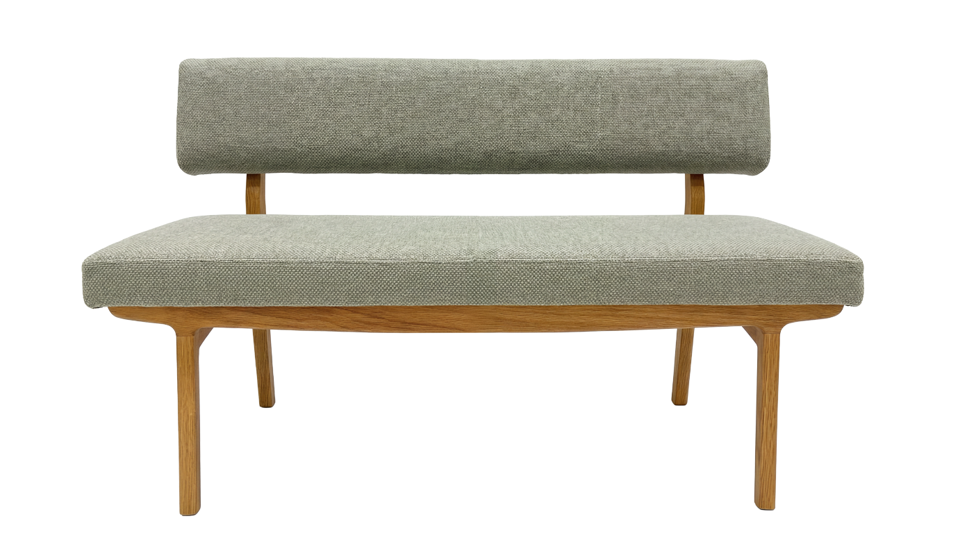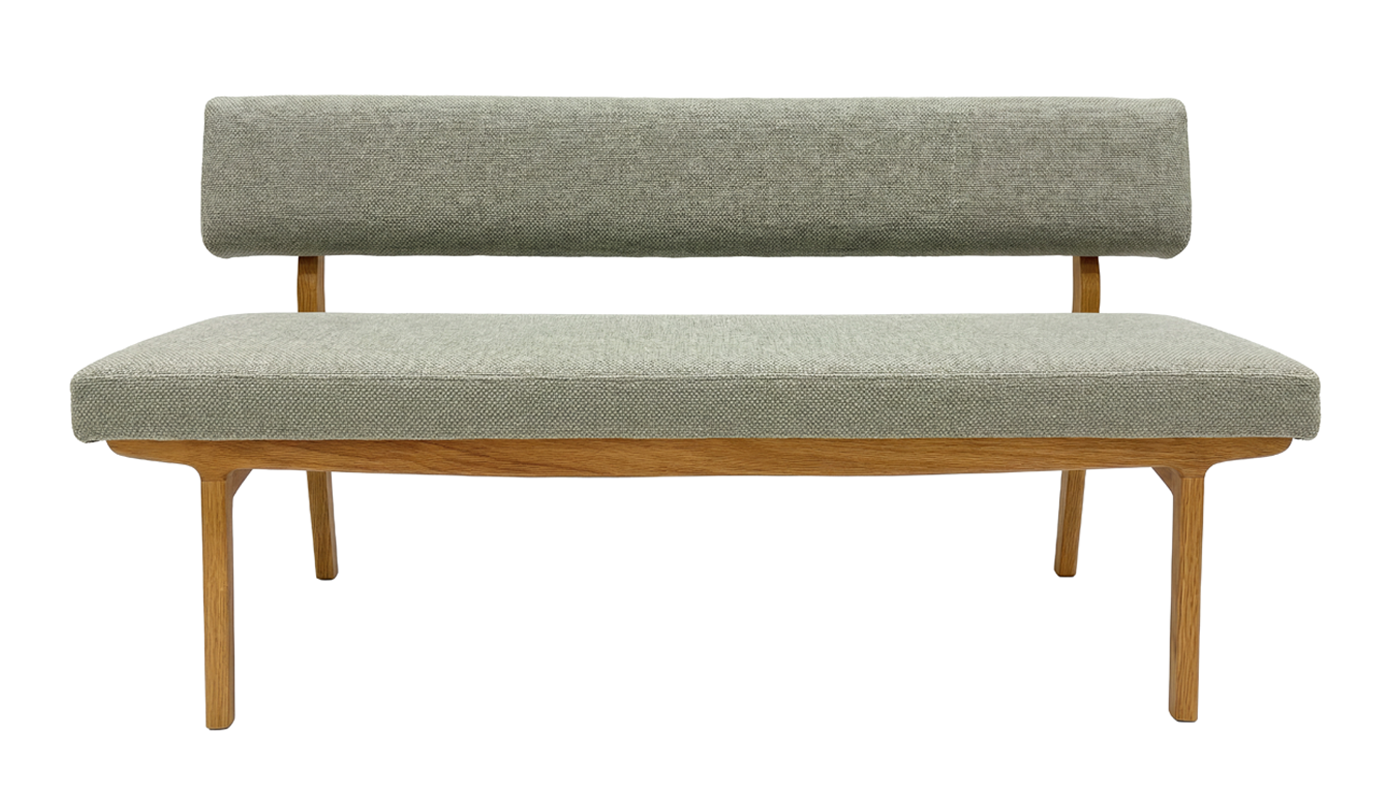 オーク無垢材の豊かな風合いを活かしたフレームに、やわらかな張り込みを合わせた背付きベンチ。ダイニングテーブルと合わせることで、ソファのようにくつろげる心地よい座り心地に仕上げました。
