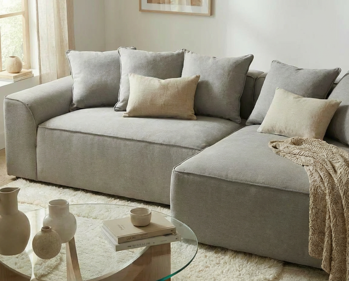 広めの奥行きで、深く腰掛けたり横になったりと自由なスタイルで過ごせます。角のないフォルムはやわらかな印象を与え、豊富なクッションとあわせて心地よい風合いを演出。
