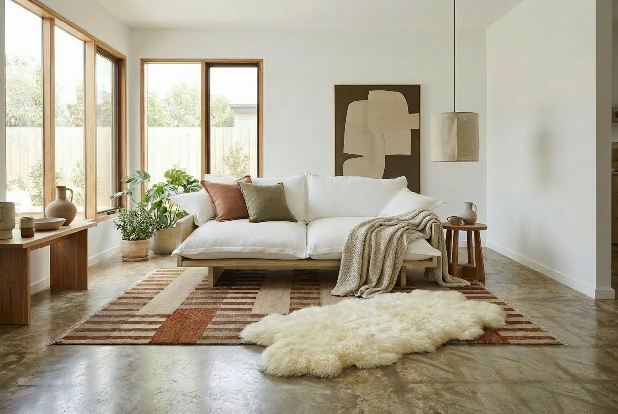 Firefly_Gemini Flash_モダンナチュラルテイストのリビングにレイアウトした画像を作って_左の植物を消して_床を明るめのコンクリート調に変更して_スローケットを